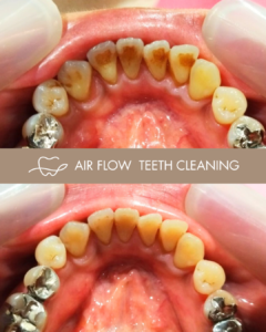 例えば下の写真のようにエアフロークリーニングという方法で、歯の裏側や歯と歯の間などセルフケアで取り除くことが難しい着色も1回の処置で取り除くことが可能です。